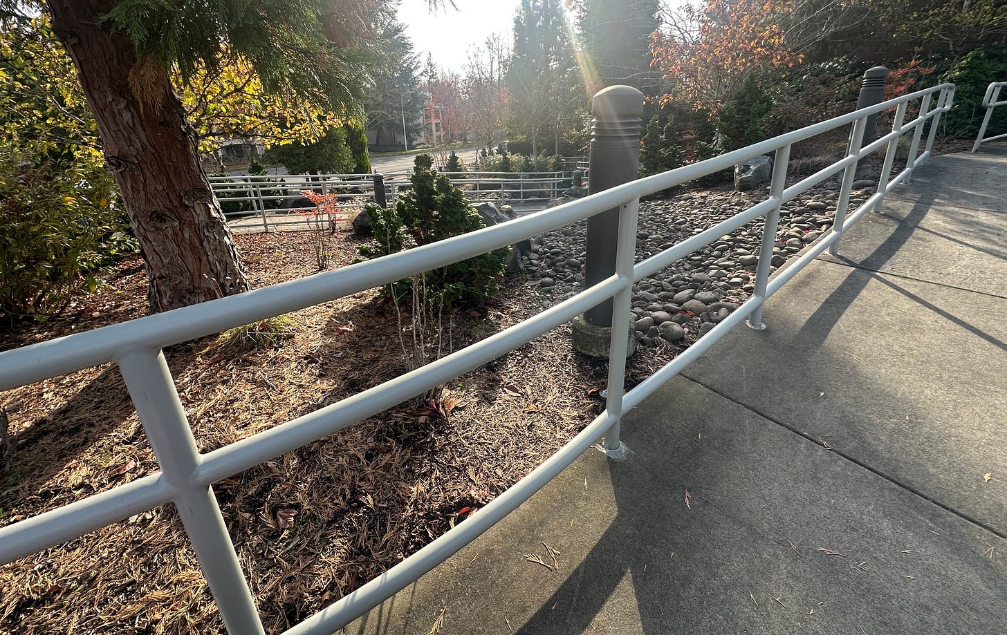 Nowadays, I have a wheelchair to navigate lengthy ramps, so they don’t bother me. E Earlier this week I encountered this one at the Kaiser Westside Medical Center. I was already a third of the way down it when I took this photo. Far in the background, you can barely make out a third set of railings.