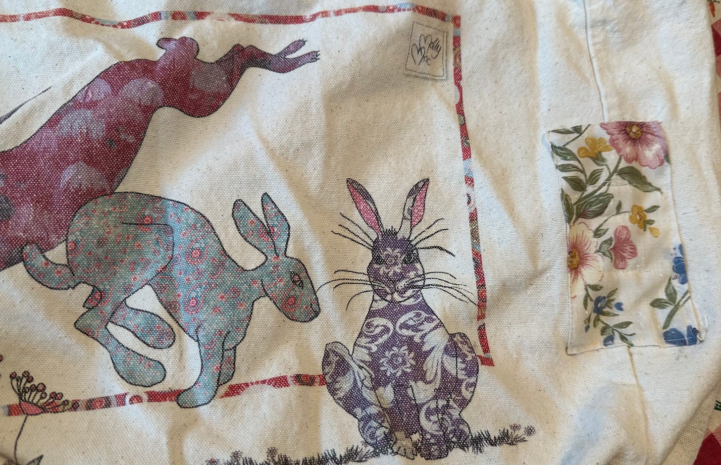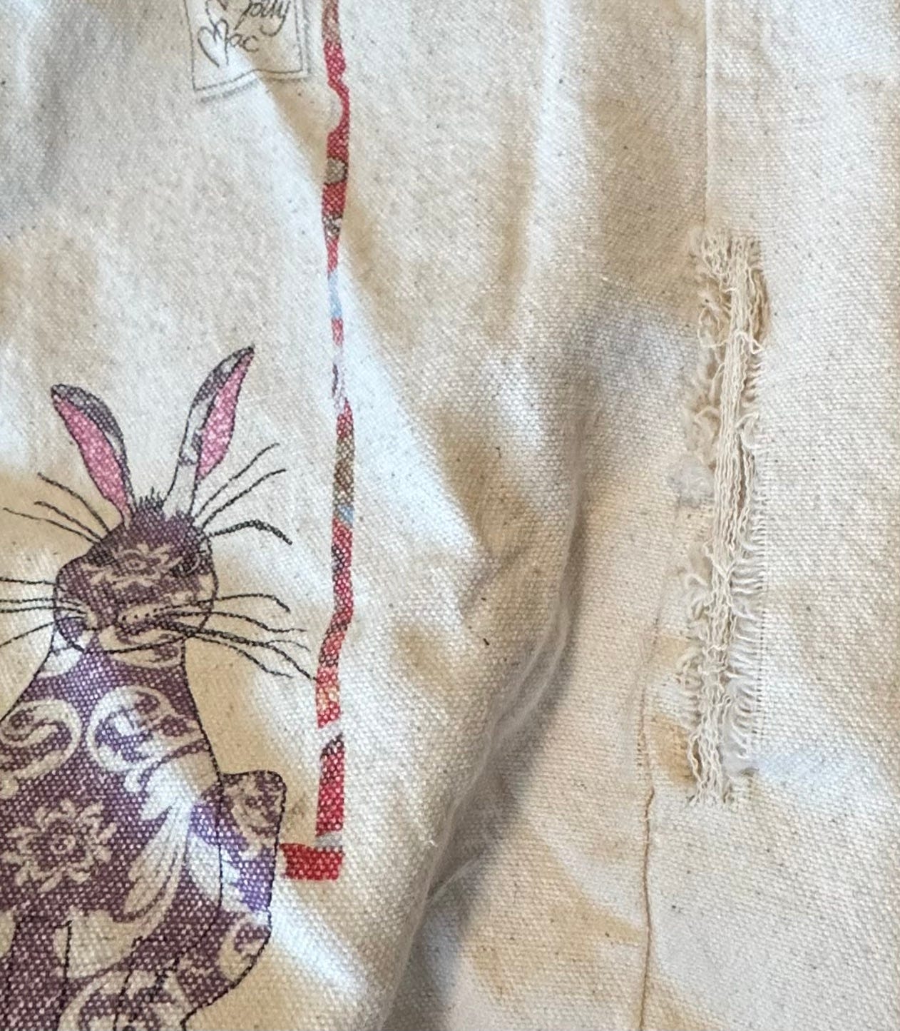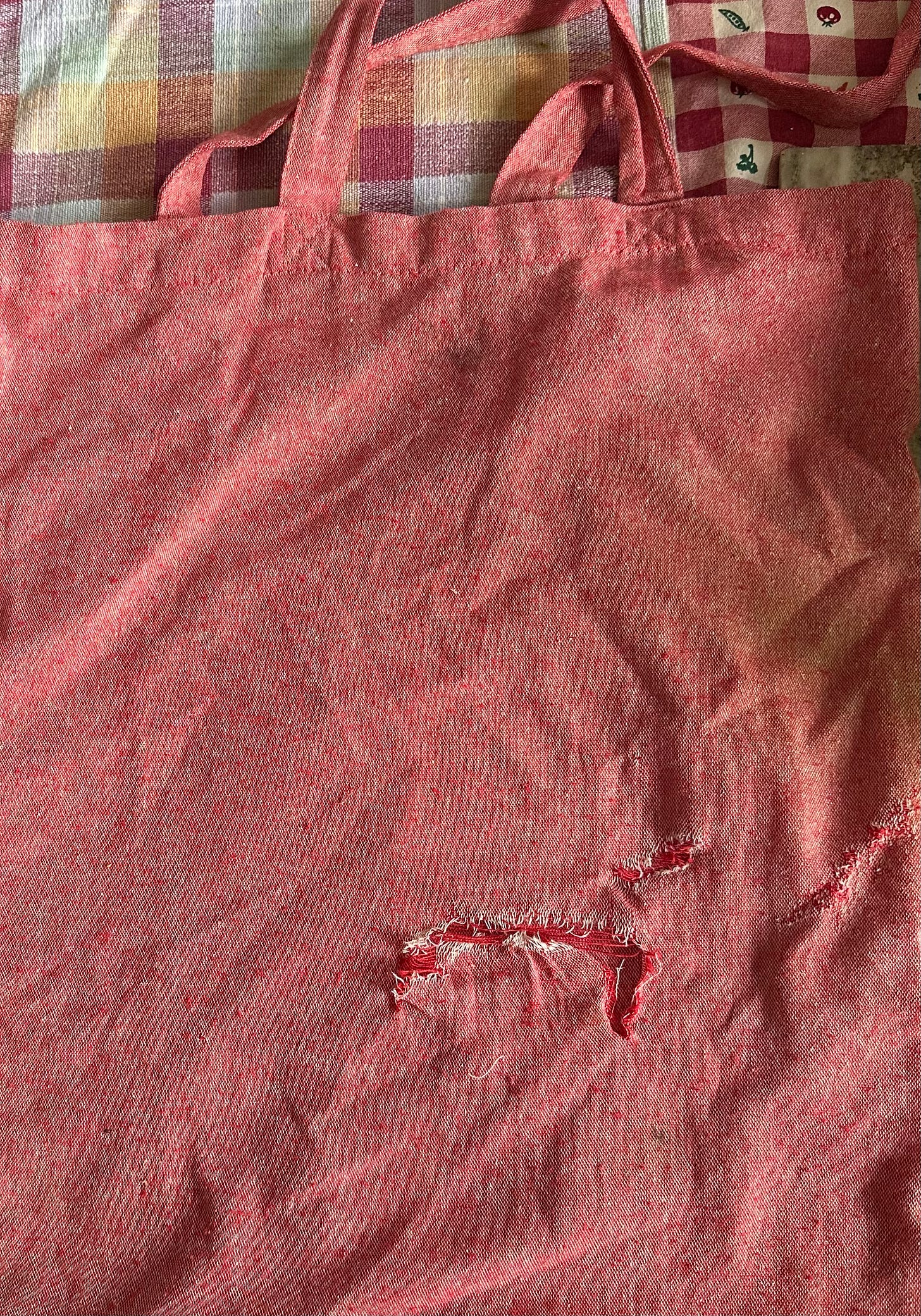 I have enough bags that I could easily just toss the torn ones. But mending these bags has made each of them unique, my own challenge and creation. Here are two of the bags I fixed.