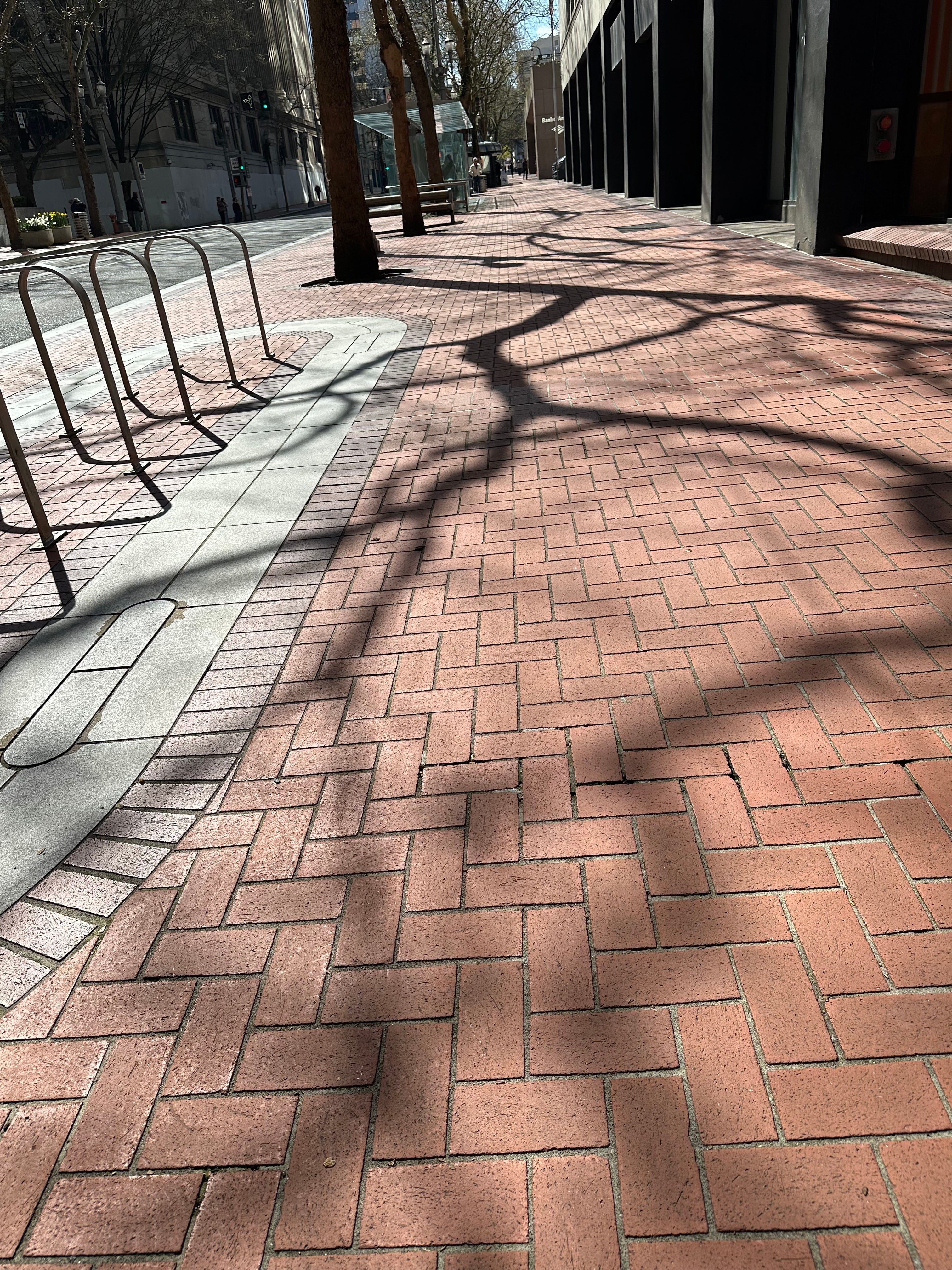 On the same day, bare winter limbs cast shadows on the bricks of the Portland Transit Mall. You can trace how the texture of the meandering lines of the branches contrast with the curves of the pavement and the bike racks, and with the stern uprights of the buildings and the tree trunks.