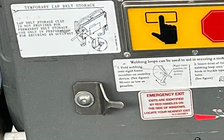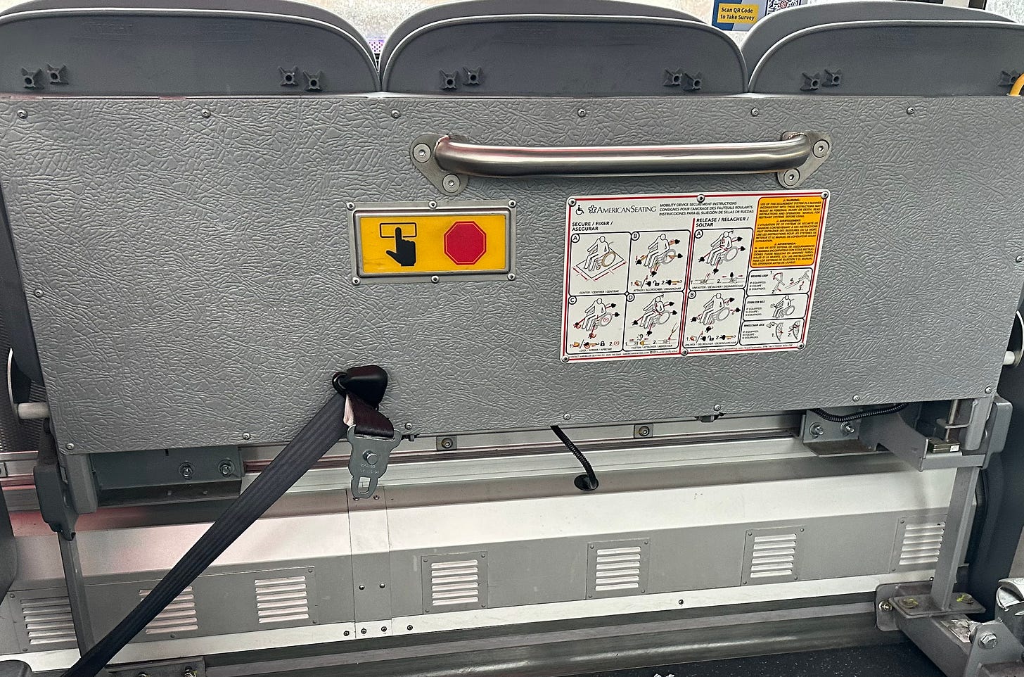 The bottoms of the bus seats that are lifted to accommodate wheelchairs, scooters, wagons and walkers often have metal flanges. These are meant to hold securement cables. Here’s a hook with a cable attached.