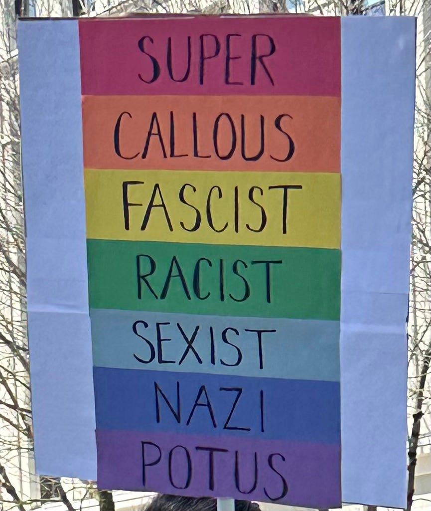 I was at Saturday’s protest party in downtown Portland, but I am sick with a cold and did not stay long. There were still plenty of handmade, heartfelt signs like the one below, but I don’t think there were as many of them. All the effort and creativity that went into earlier signs—for what? I did see a lot of signs that said simply NO KINGS or FUCK ICE! And I liked the one with a cartoon of the president and the label “Operation Epic FUBAR.”