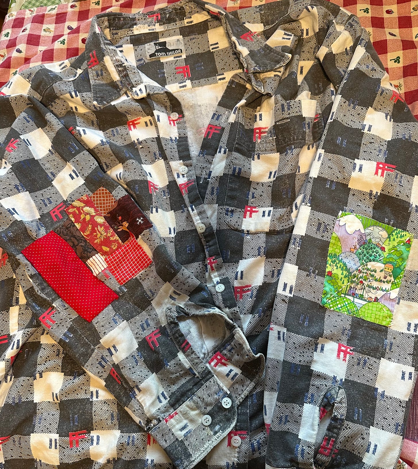 While I was at the sewing machine, I added another patch to my favorite shirt. It has red F’s, like for Fran, and goes with just about anything as an overshirt. I added the bright red patch to cover a fresh hole. I turned the collar on this shirt a few years ago, hiding the frayed edges and giving it new life.