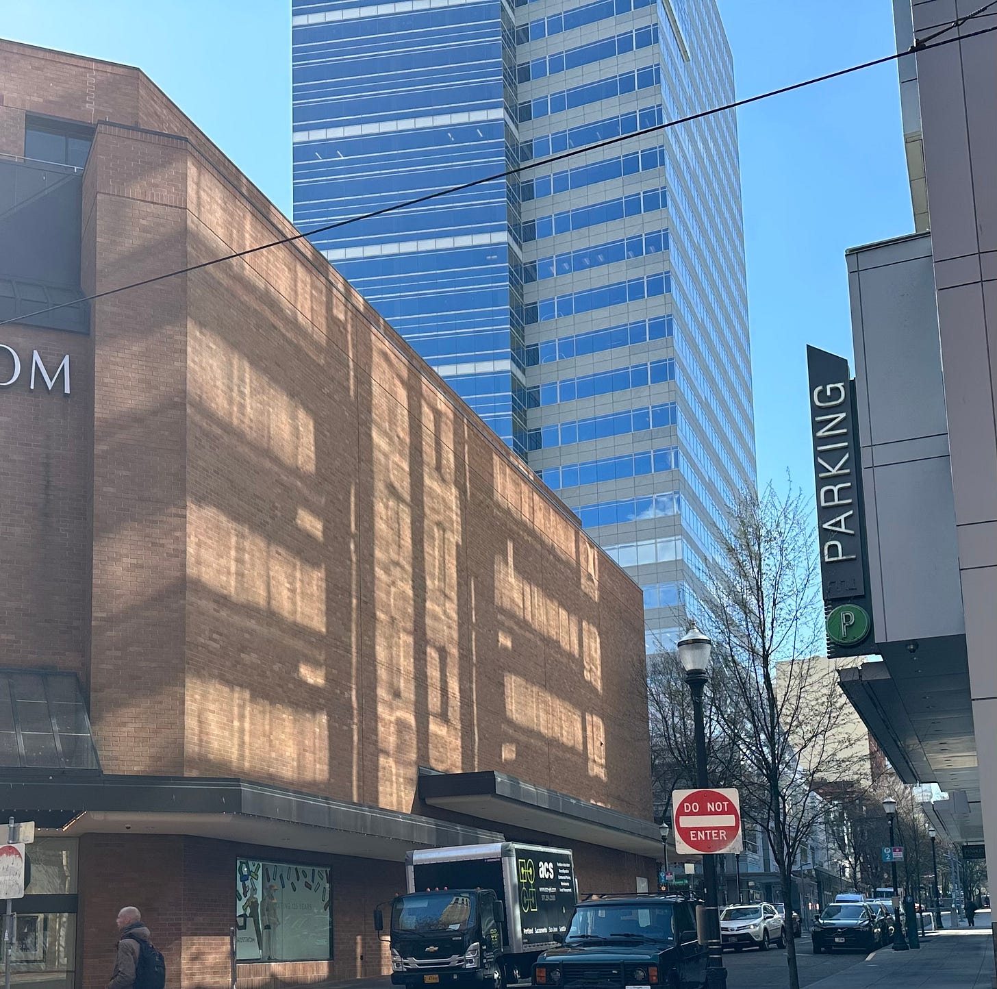 Normally, the west wall of the downtown Portland Nordstrom store is plain bricks. But on a super sunny day, the reflection of the sun in the office’/parking building opposite cast a strong grid over it.