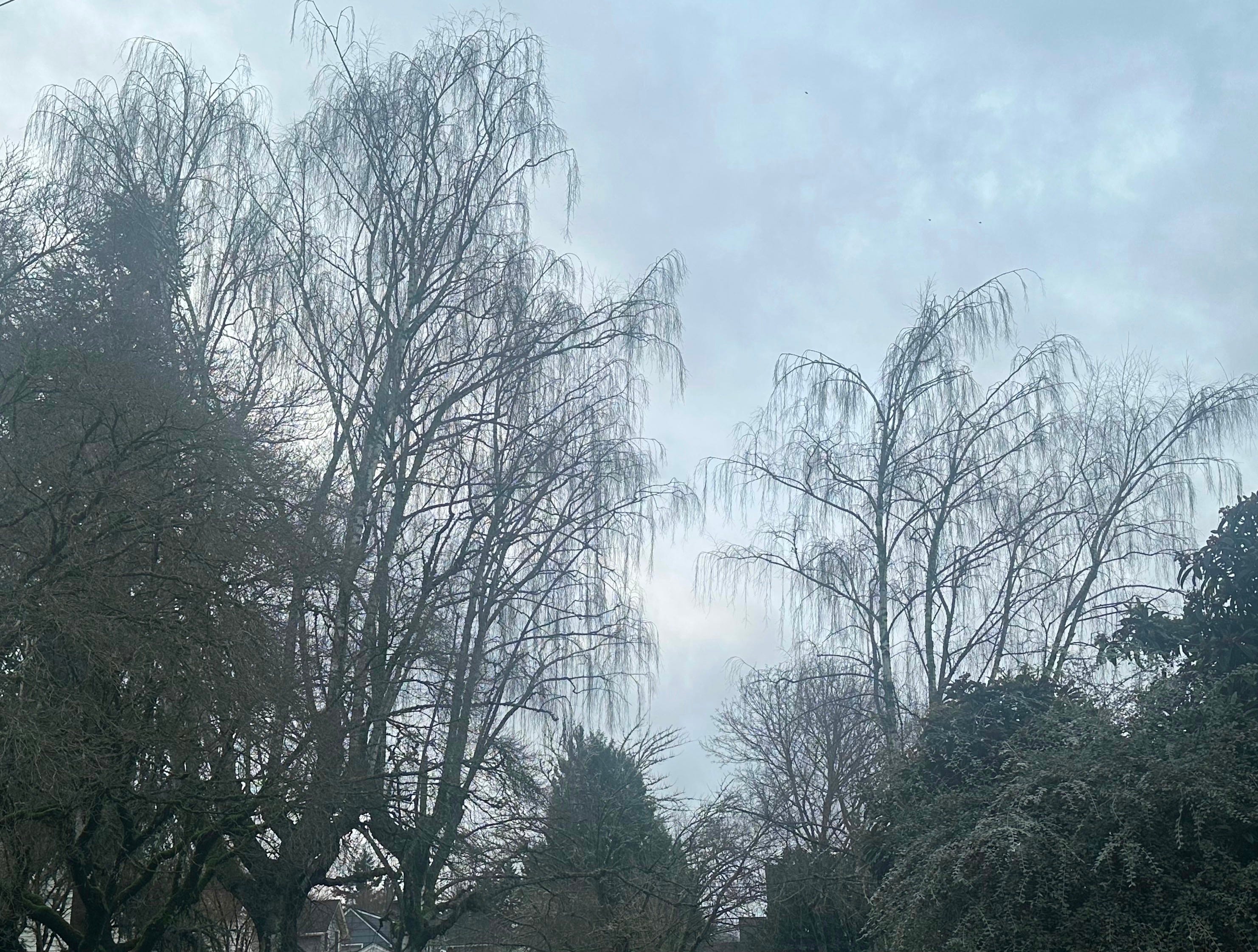 Outside, the trees are dignitaries, wrapped in robes of certainty. Nothing is more certain that a perfectly conical cedar or the drooping branches of a weeping birch. All these trees, a symphony. Bare branches and evergreen dressing.