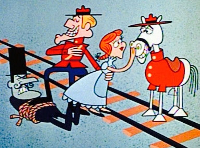 I feel like Nell Fenwick, tied to the train tracks by Snively Whiplash in “Rocky and Bullwinkle.” She’s always saved at the last moment by Dudley DoRight of the Mounties and his horse, Horse.