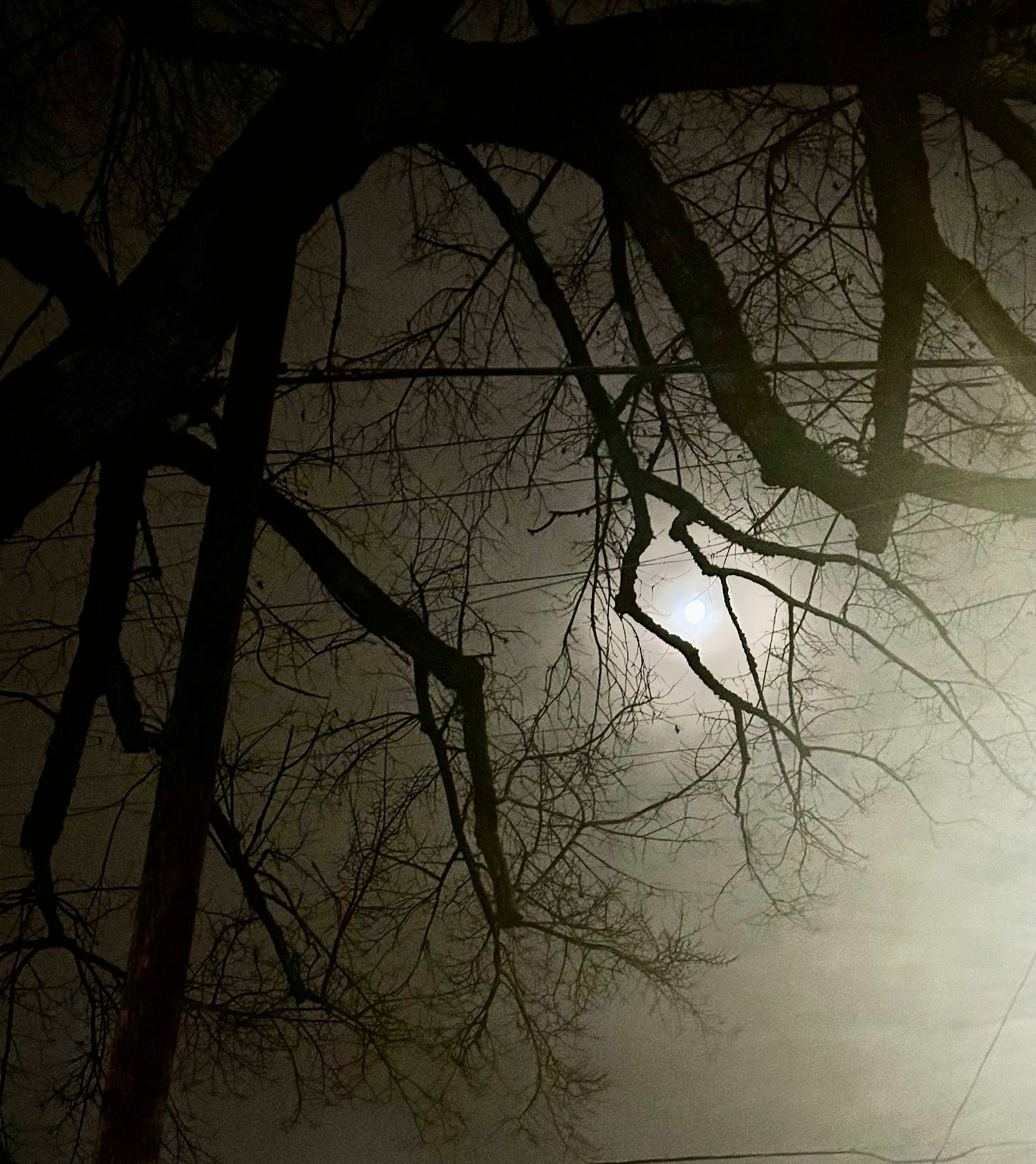 This week I chased a gibbous moon, what the poet Alfred Noyes described as “a ghostly galleon.” Here it is captured in the limbs of an elm.