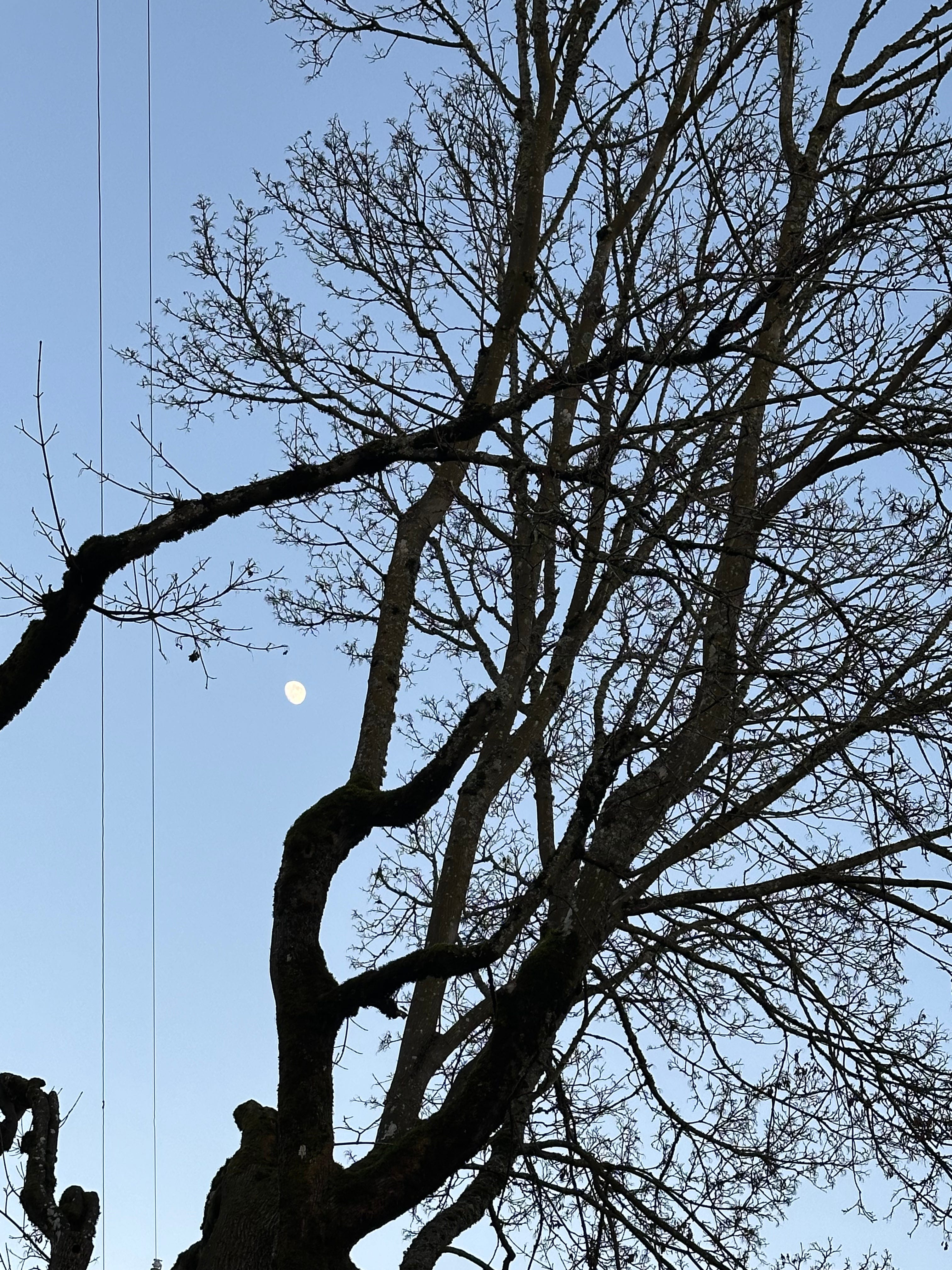 Later in the morning, the moon is a tiny dot in a blue sky. Same tree, different angle.