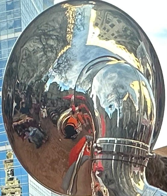 After having published a couple of photos of deep brass players at Portland’s Tuba Christmas concert, I gave these photos a closer look. I’m in them! The reflection in the bell of this tuba shows a woman in blue in a wheelchair, camera raised. That’s me.