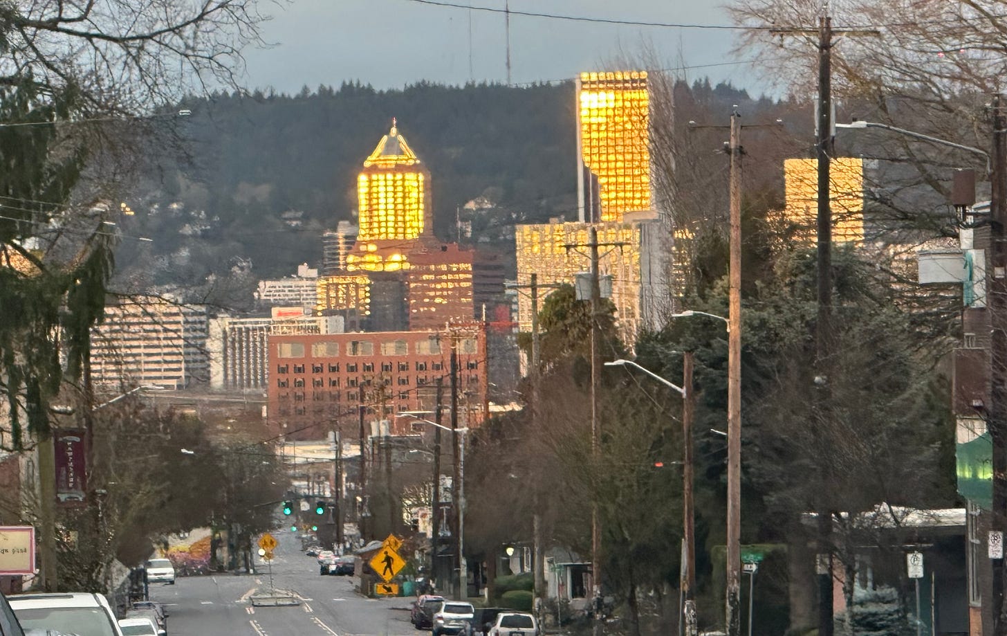 I got out early on Christmas Day to catch a shaft of brilliant dawn light illuminating downtown skyscrapers.