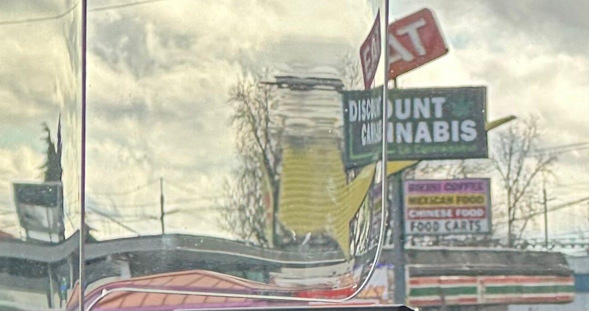 Passing through the small settlement of Linnton, I grab a shot—through the front window of the bus—of a sign that I had noticed on the way out: a big restaurant “eat” on top of a sign for a cannabis outlet.