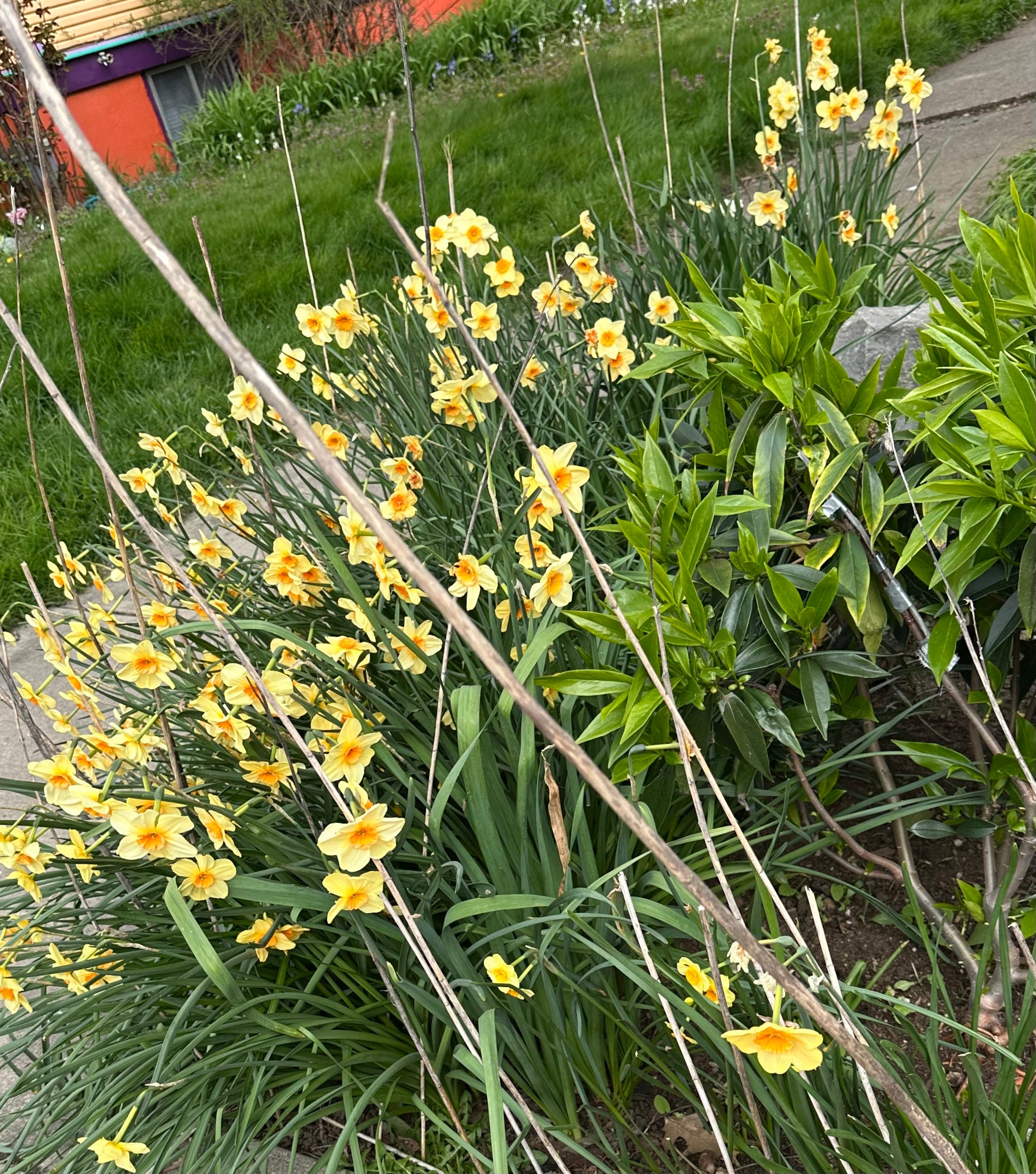 A woman named Alison came over while I was photographing this stand of daffodils in her parking strip in Sunnyside. I said it was a Wordsworthian stand of the flowers, referring to Wordsworth’s famous poem, “I wandered lonely as a cloud.” Most of the daffodils I see in my wanderings are in clumps of two or three.