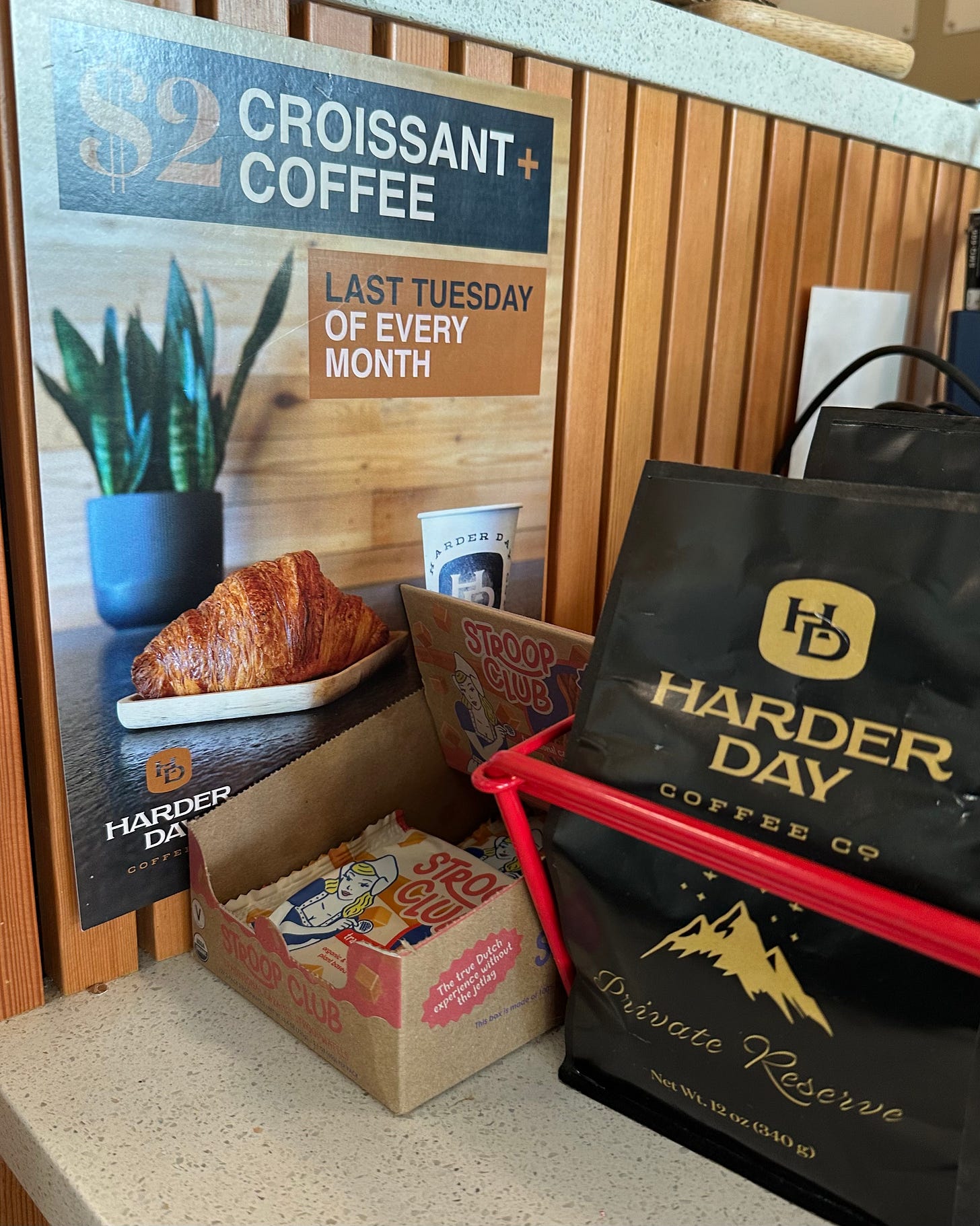 Harder Day Coffee Co., at Southeast 38th and Belmont, has a big old sign by the register advertising coffee and a croissant for $2 on the last Tuesday of the month.
