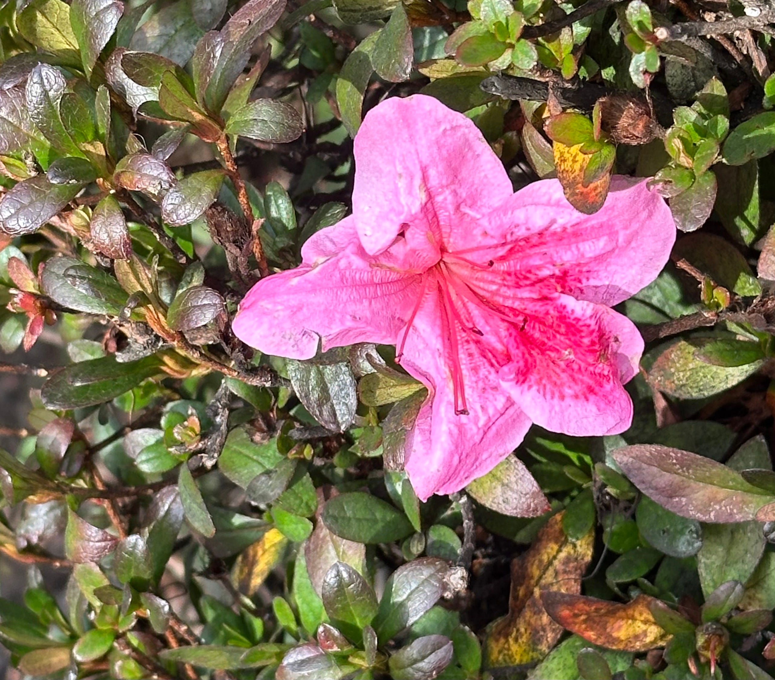 Also on Christmas, I photographed a newly opened azalea blossom. Azaleas are blooming all over my neighborhood already. They are traditionally spring bloomers.