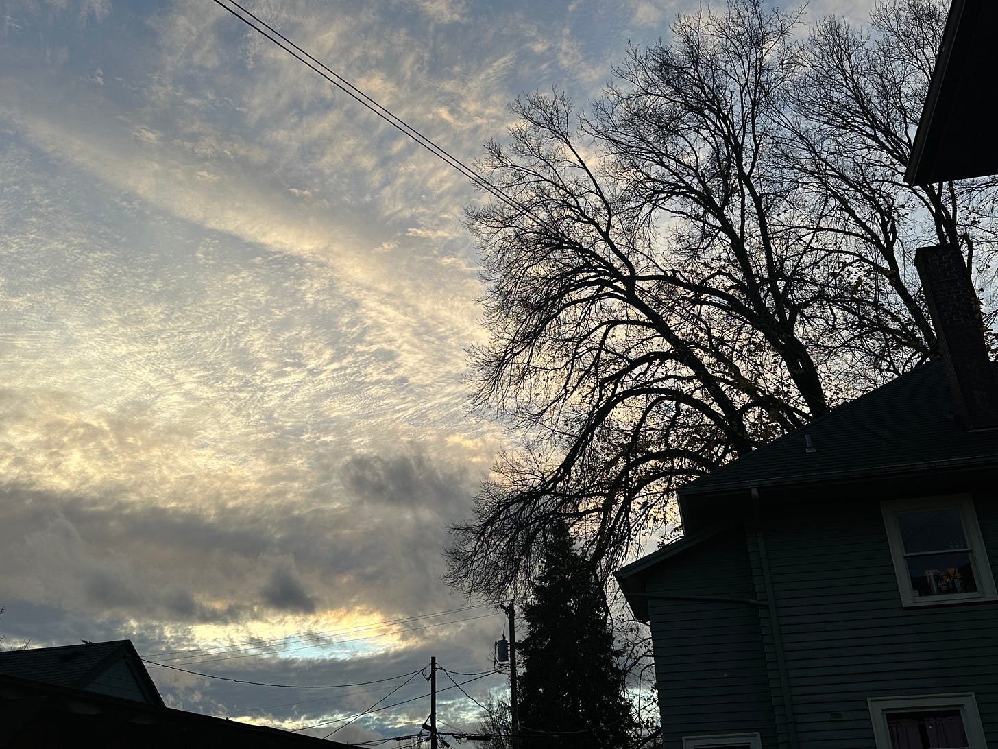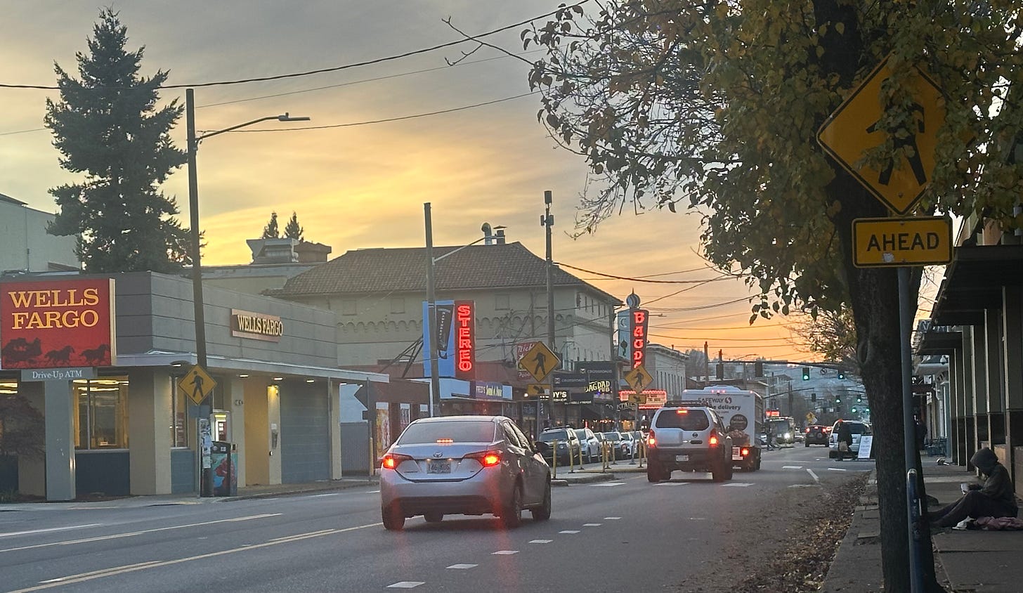 Winter means rain in Oregon, and we have lapsed into a season of gray skies and nearly continual moisture. Now the magic of light comes from the occasional lighted window, a promise of warmth and inclusion, a refuge from the downpours.