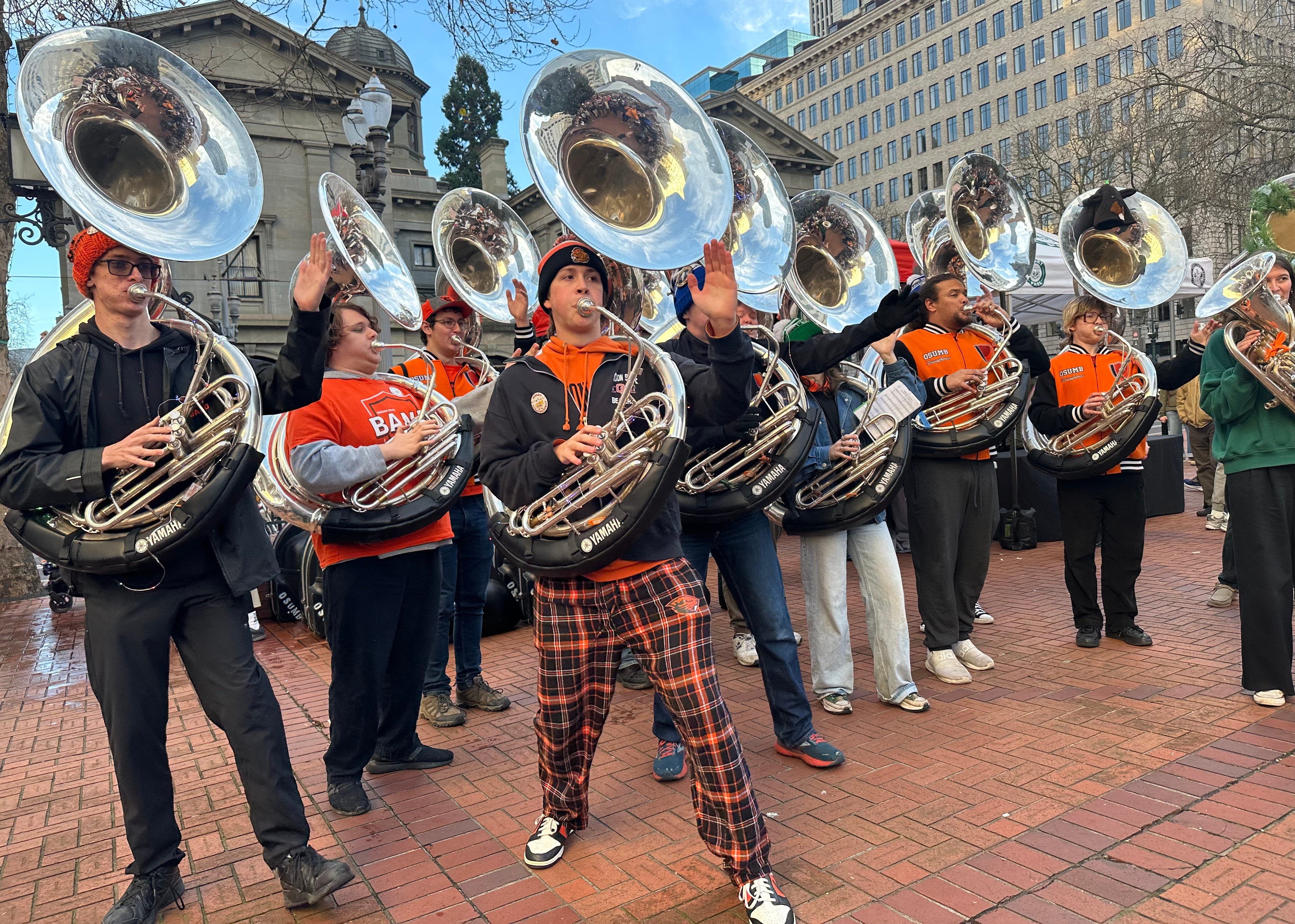 Warm, sonorous blasts, hitting the heart Opening and folding, Filling and brimming, Kindness in the crowd as people make way. Smiles and greetings On a dry winter’s day, No hard words, just tubas —and the occasional euphonium. A chid with a peppermint, A man with a dog, Babies in strollers, Old folks with canes. Many wear sweaters I wouldn’t call ugly, More like art for this season Of kindness to all.